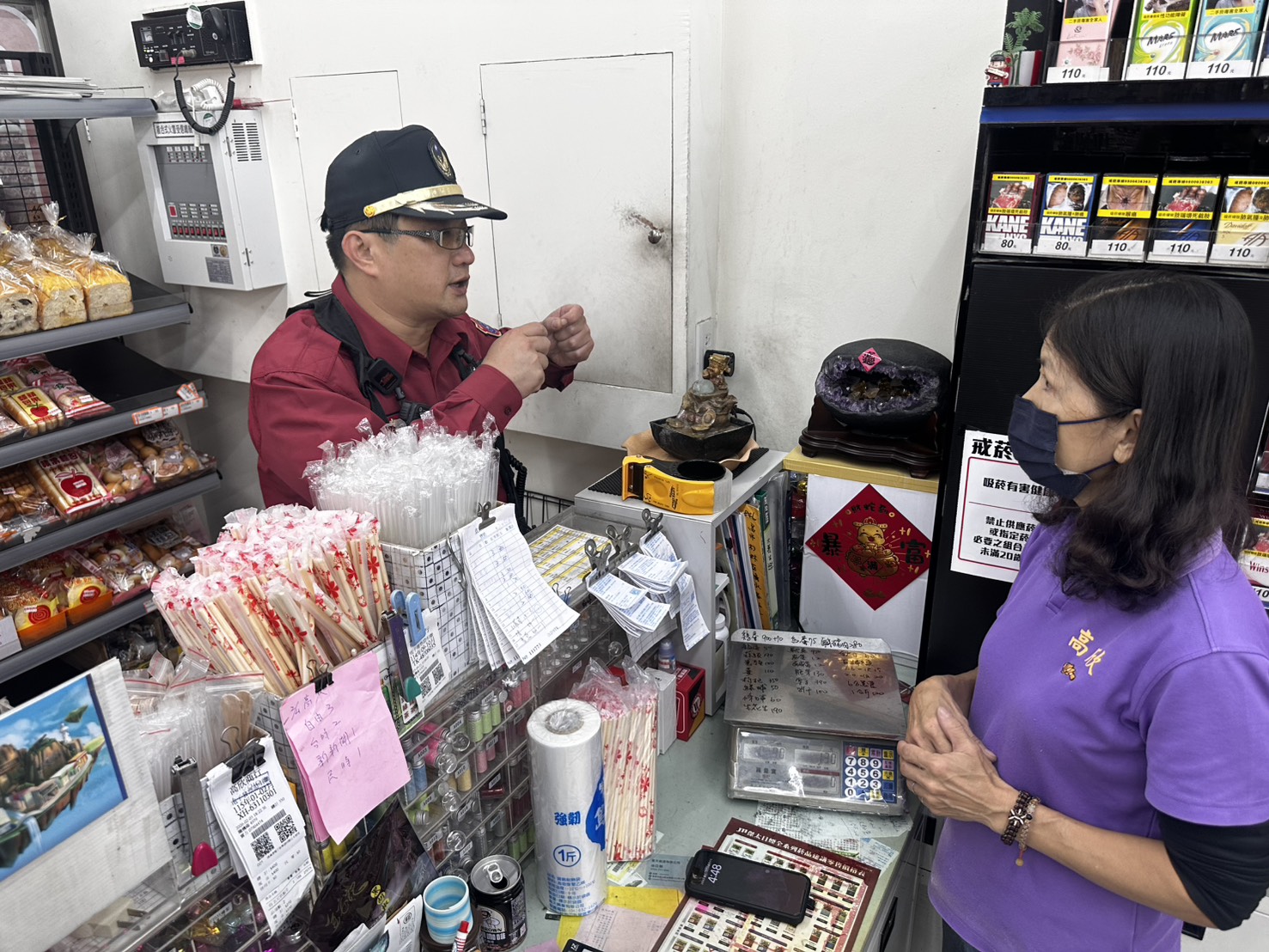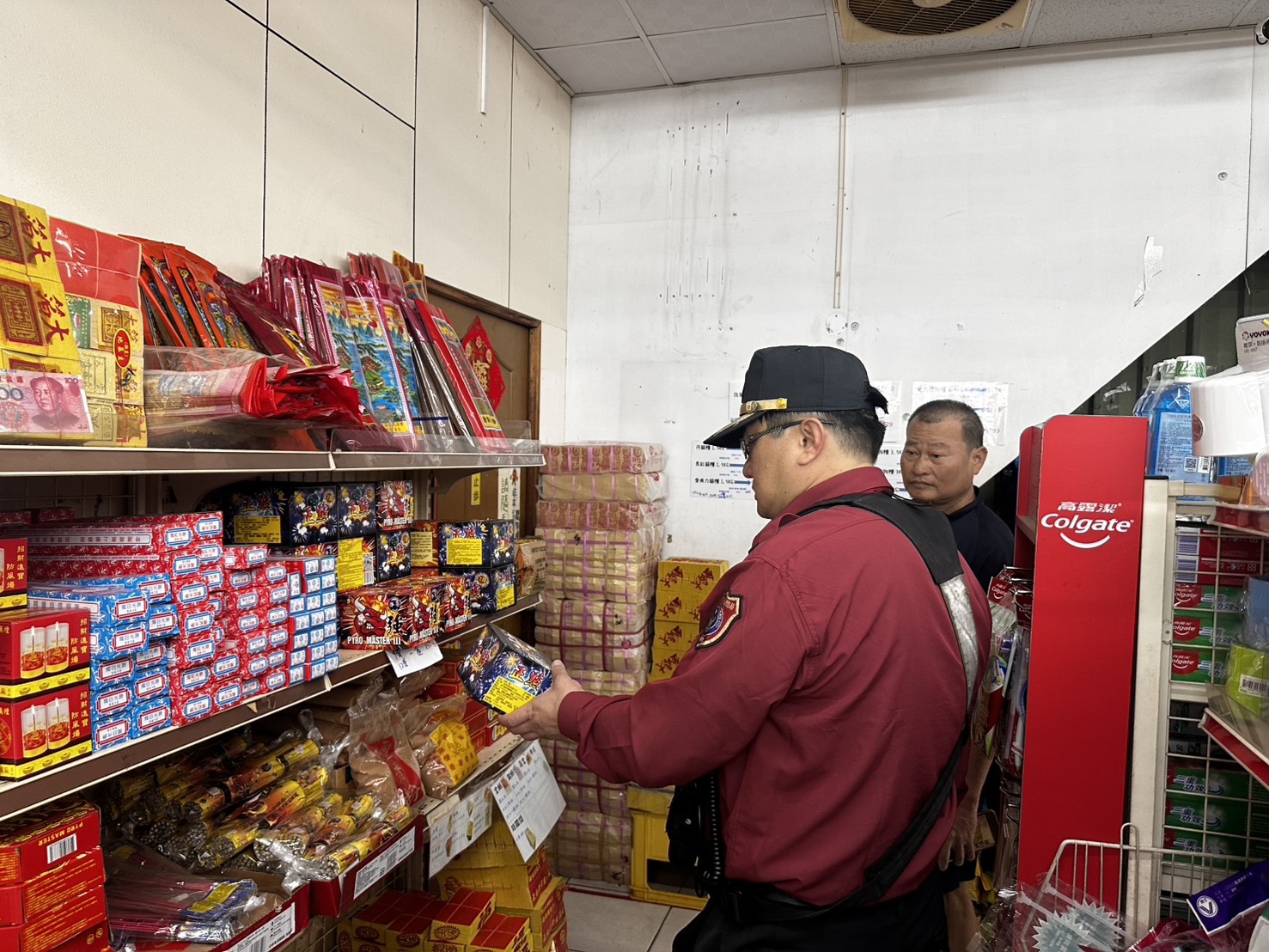 購物民眾也向消防人員詢問燃放爆竹注意事項,分隊長楊紹功也熱心告知:須購買附有認可標示的產品並遵守相關使用方法,兒童施放爆竹煙火,應由父母陪同。
