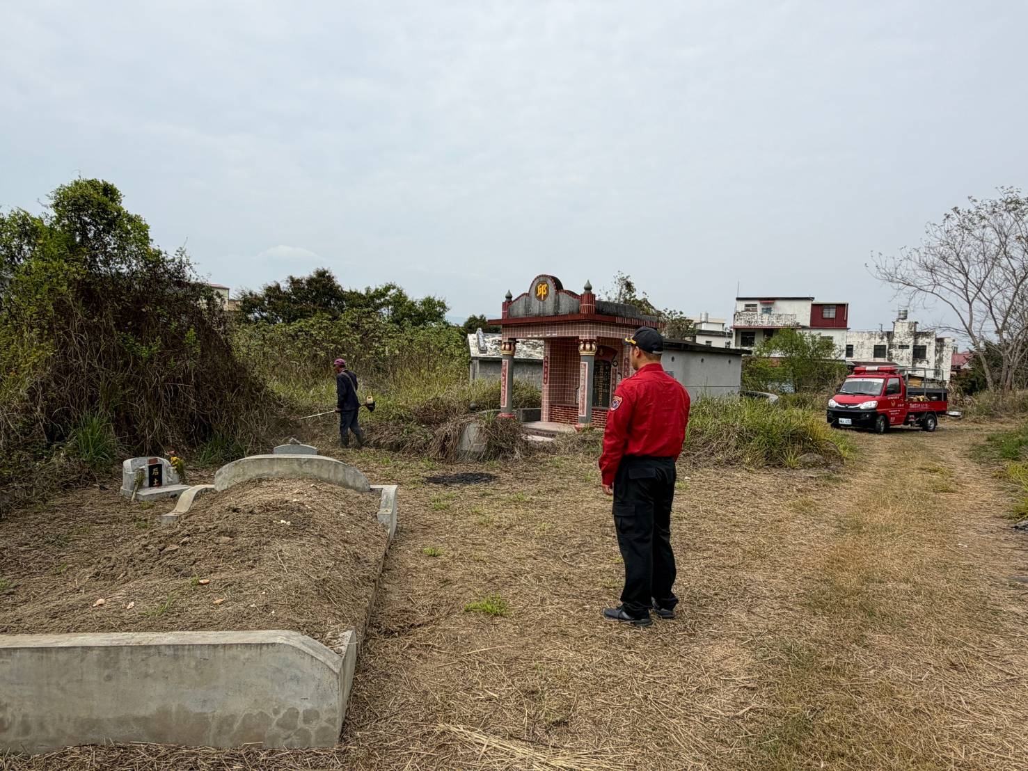杉林區多處公墓因地形特性及枯枝落葉堆積,過往常成為山林火災易發熱點。為從源頭降低危害,杉林分隊與杉林區公所合作,於清明前展開大規模除草作業,清除易燃枯草與蔓藤,減少火勢延燒可能。區公所亦協助於墓區內放置大水桶並提前加滿水,提供民眾在焚燒金紙後可立即撲滅餘燼,避免火花飛散引發意外。