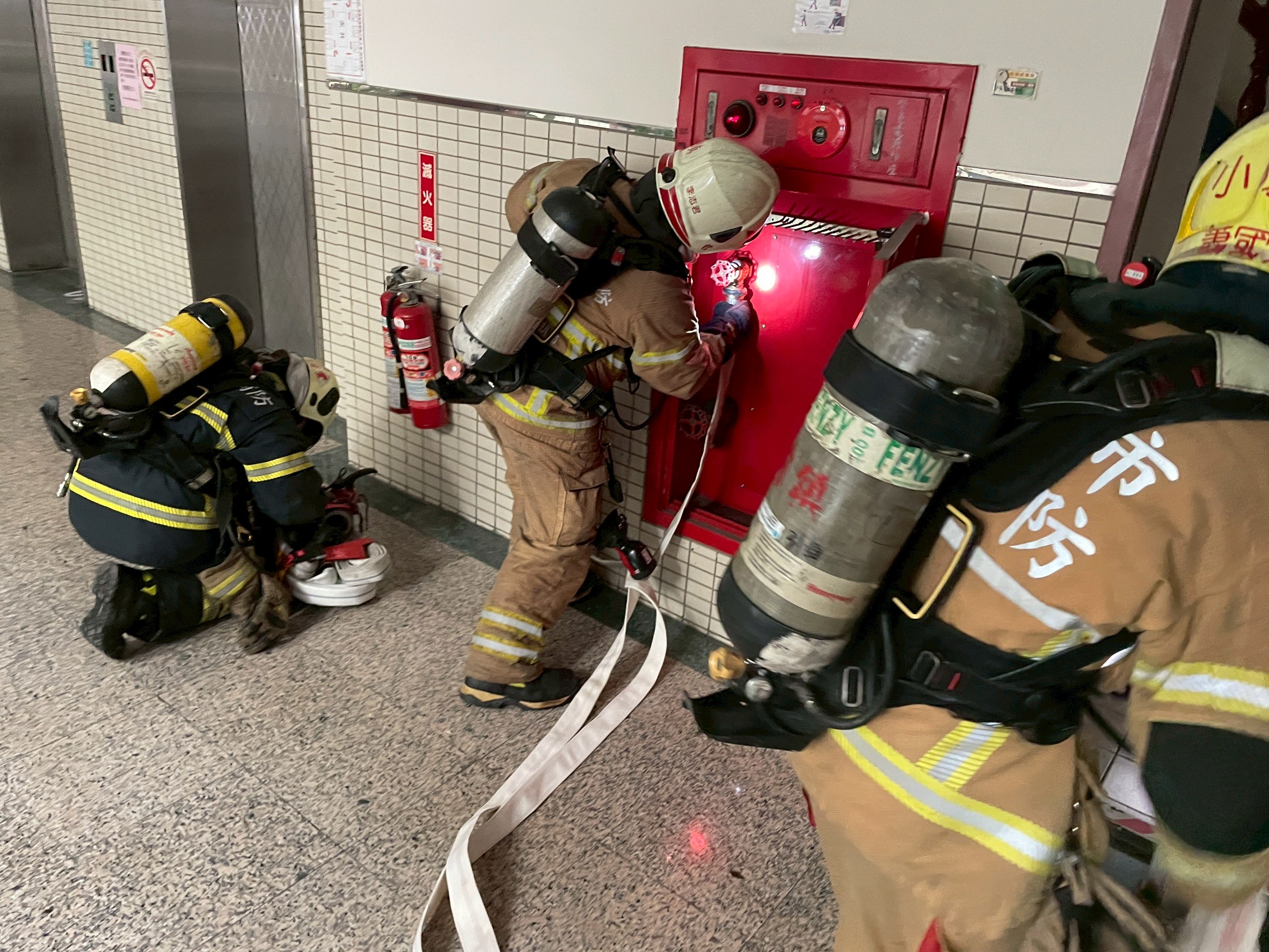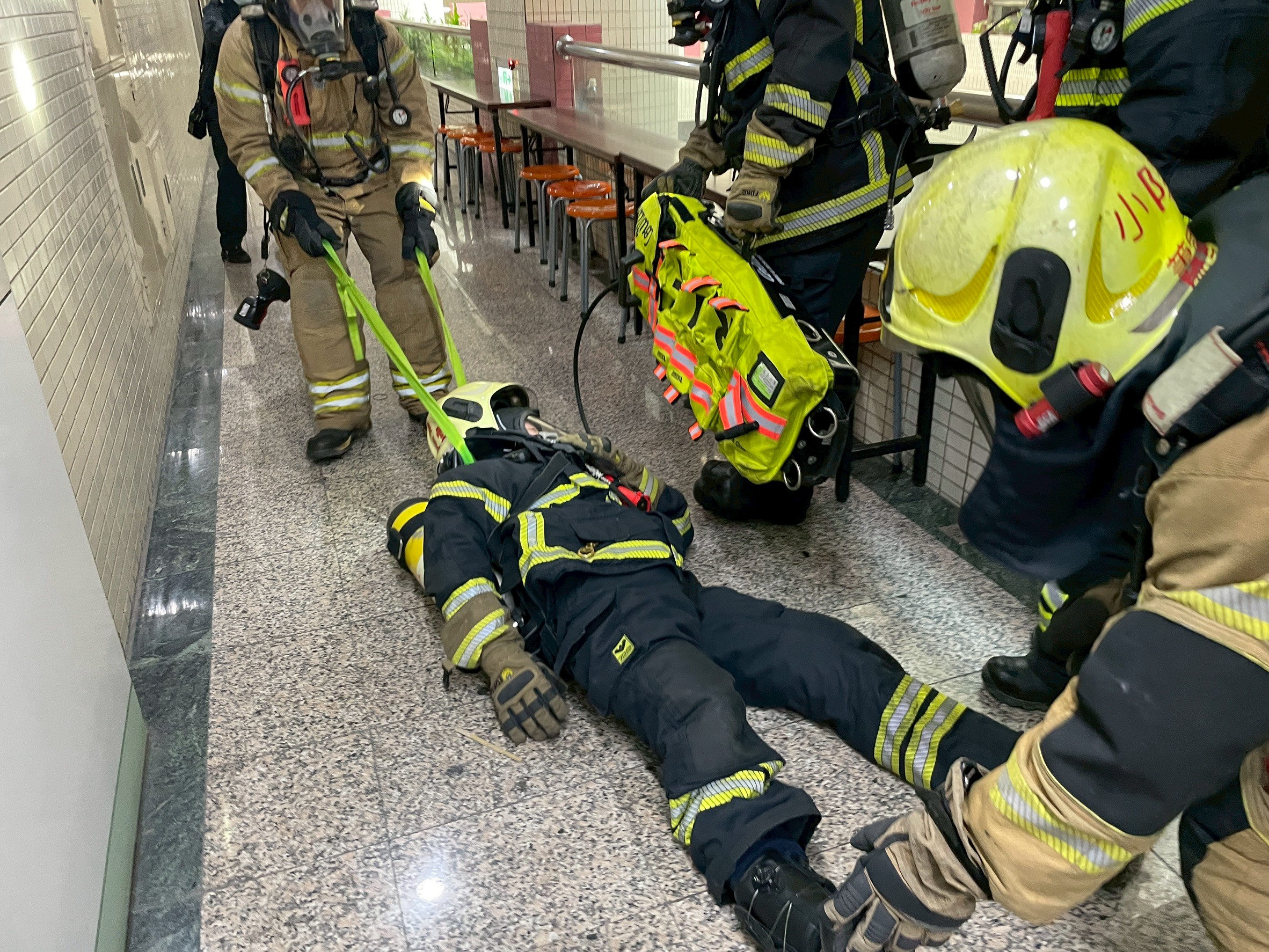 演練過程中消防人員運用建築物緊急用升降機及連結送水管進行救災,並使用熱顯像儀確認起火點快速撲滅火勢及殘火處理,於12樓搜索發現腿部受傷無法移動員工,搭配雲梯車協助疏散傷者。另模擬消防人員於搜索時不甚遭雜物壓傷並撞擊氣瓶導致快速漏氣,啟動MAYDAY求救程序,RIT人員運用快速救援包(AirBag)協助供氧並迅速帶離火場。