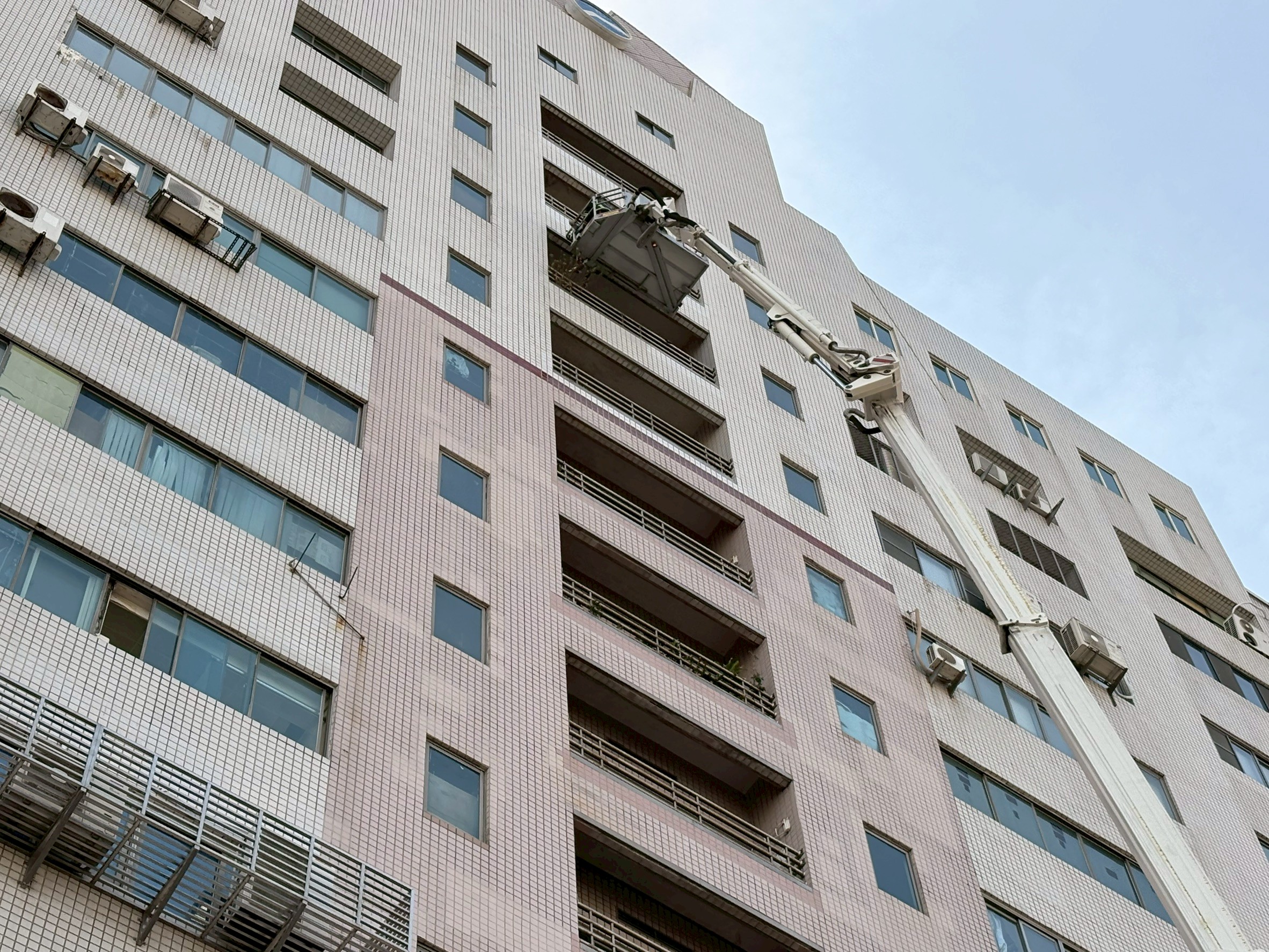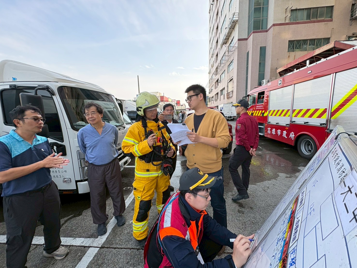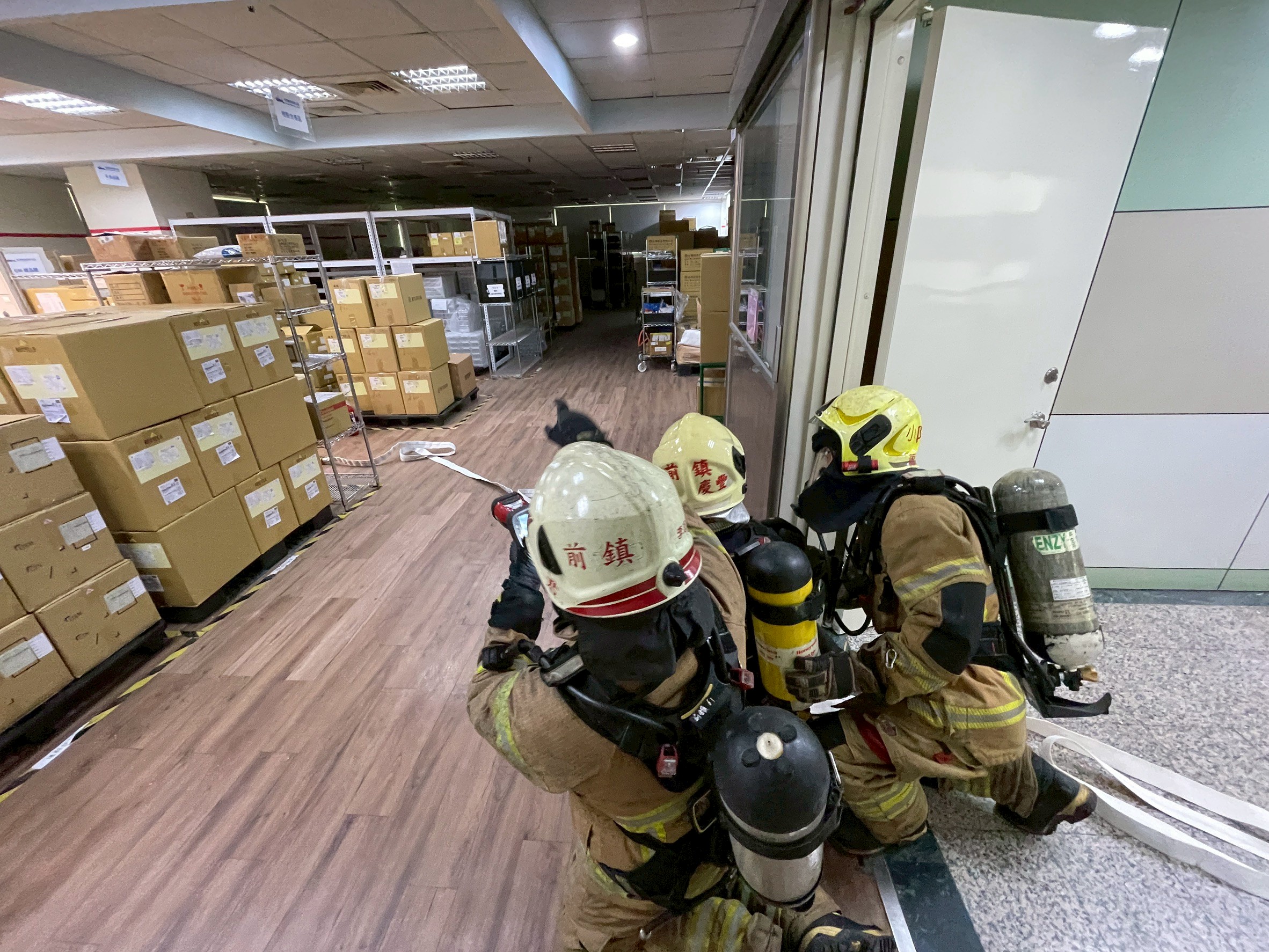 為提升廠辦大樓高風險場所面對火災應變處置能力,高雄市政府消防局第一大隊第二中隊於本月(31)日下午14時假前鎮區遠東ABC工業園區大樓辦理「員工自衛消防編組演練及消防火災搶救演練」,模擬A棟11樓佐茂股份有限公司研發倉庫不明原因發生火警,業者啟動自衛消防編組,消防局接獲通報後動員多台救災、救護人車、裝備進行搶救,演練過程中,充分展現業者自衛消防編組的應變能力以及消防單位在高樓廠房的搶救應變能力。