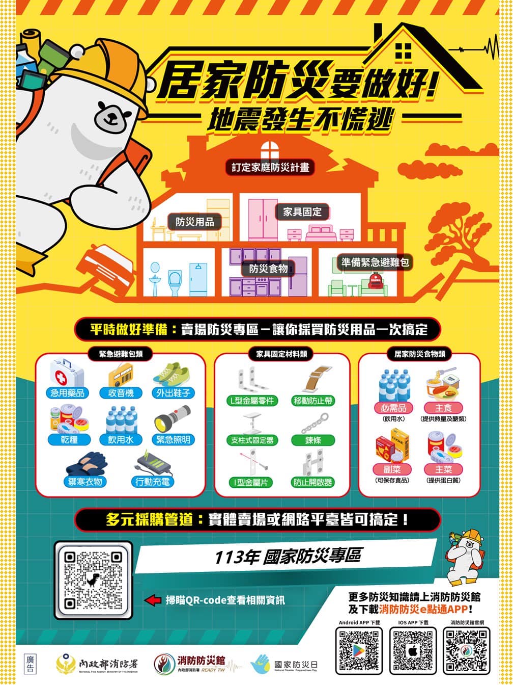 市民朋友記得每半年應定期更新緊急避難物資,並準備符合自己需求的「緊急避難包」,放置在家中門口處或隨手可拿到的地方。