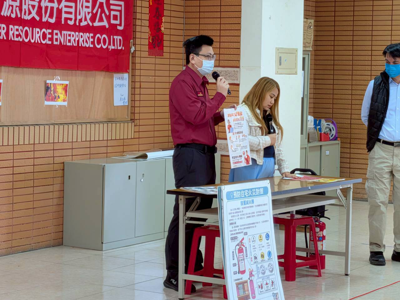 為了讓移工朋友們能熟悉報案流程,除了細部講解報案的步驟外,更請人員上台實際模擬報案內容,遇到災害該如何撥打正確報案電話號碼、詳述災害發生地址及有無人員受困;以及教導滅火器的使用方式,讓人員在遇見初期火災時該如何正確滅火,從體驗中建立正確防災觀念,最後再教導用火用電注意事項,透過實作讓活動更加生動有趣。