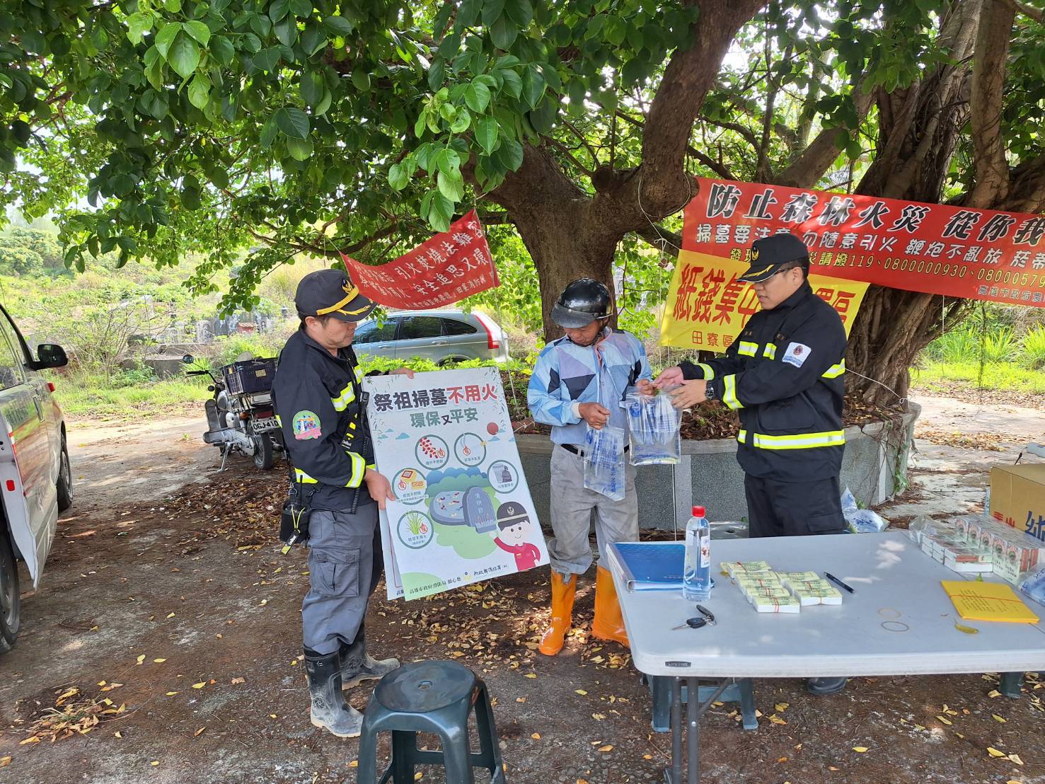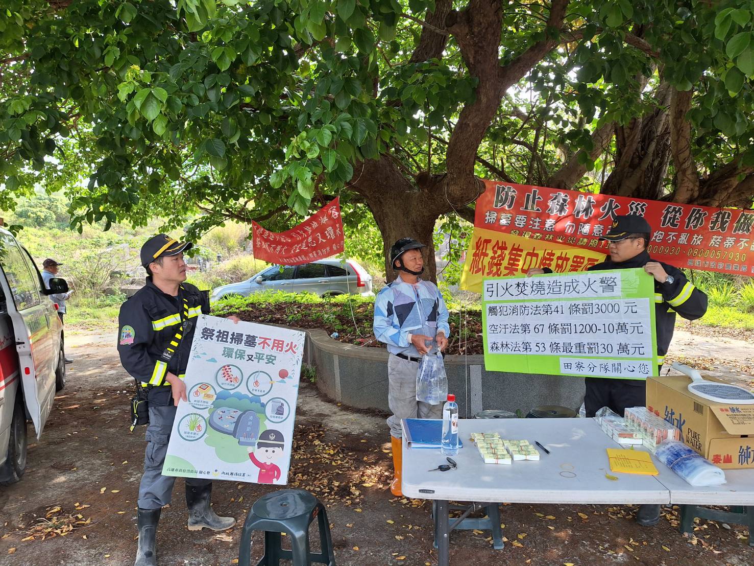 今年田寮消防分隊協調區公所事先清除各墓地周圍雜草,亦協調林業保育署旗山工作站進行阻燃劑噴灑,透過移除可燃物及環保無毒阻燃劑噴灑作業,進而有效開闢防火巷避免火勢延燒,期望在結合各單位共同努力之下,減少山林火警的發生。同時在清明節期間田寮公墓消防駐點處有提供祭祀疏文,讓民眾能書寫祭祀資料並紙錢封裝集中,疏文上有名字與民眾親手燒金紙的效果相同,避免擔心祖先收不到的疑慮。現場填寫祭祀疏文集中焚燒紙錢,便可獲得精美小禮物,防範火災還有好禮可拿。