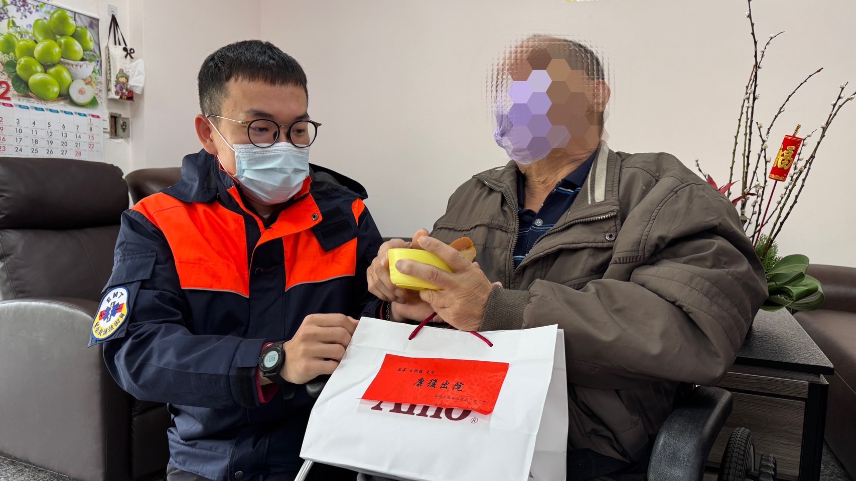高雄市政府消防局甲仙分隊於農曆年前接獲報案,一名63歲男性在家中食用爆米香卻造成呼吸道哽塞後失去心跳,趕抵現場的救護人員除了依照流程施予哈姆立克法急救外,亦啟動「偏鄉山區緊急救護接駁」機制,由鄰近杉林分隊派遣高級救護技術員(EMT-P)在送醫途中介入急救,成功挽救患者生命。本(25)日由中隊長林志遠偕出勤同仁到患者家中訪視並致贈祝福禮品,患者與家屬對於本局救護處置能力深表讚賞,場面相當溫馨。