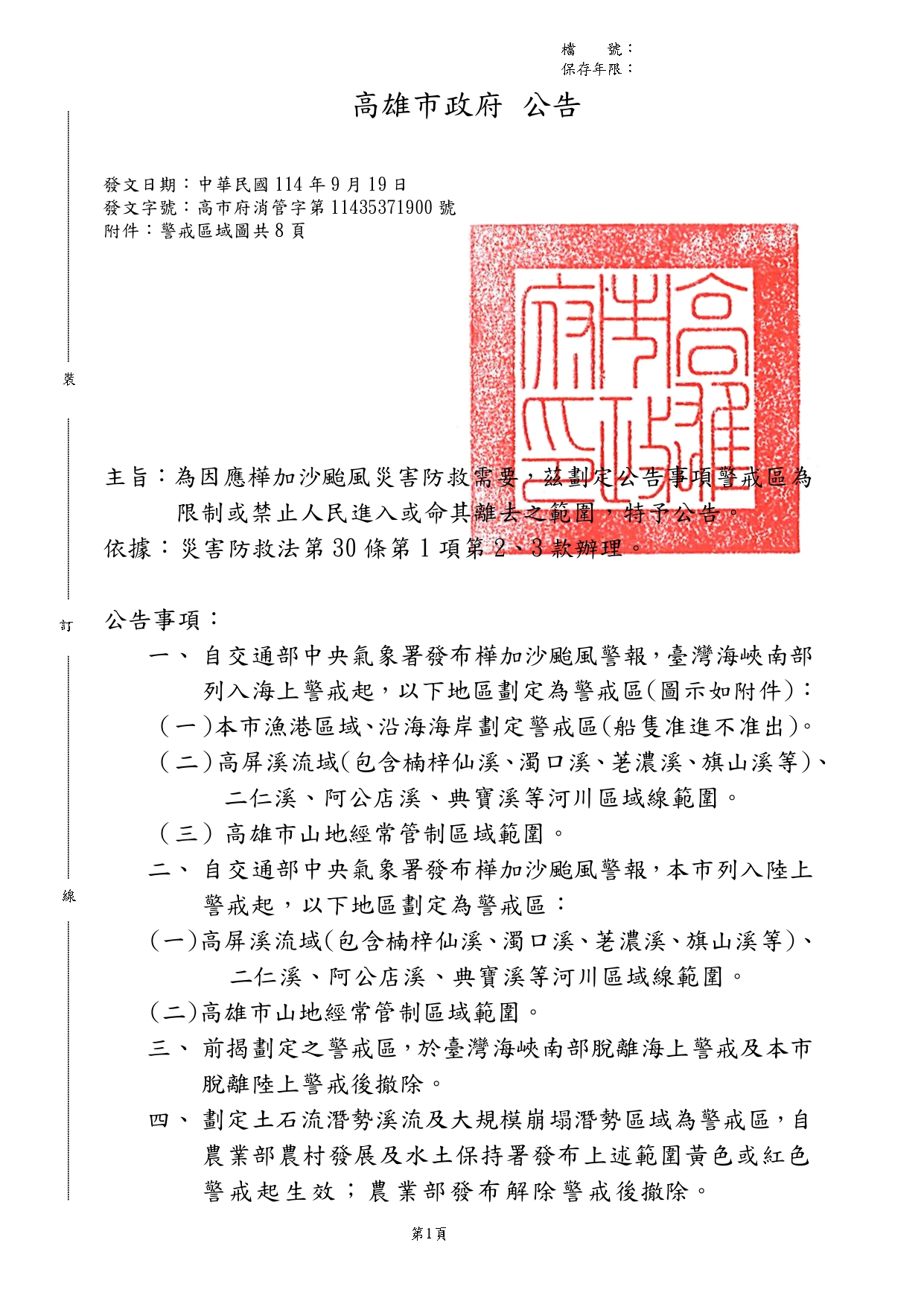 1140919樺加沙颱風警戒區公告(正式)含圖資